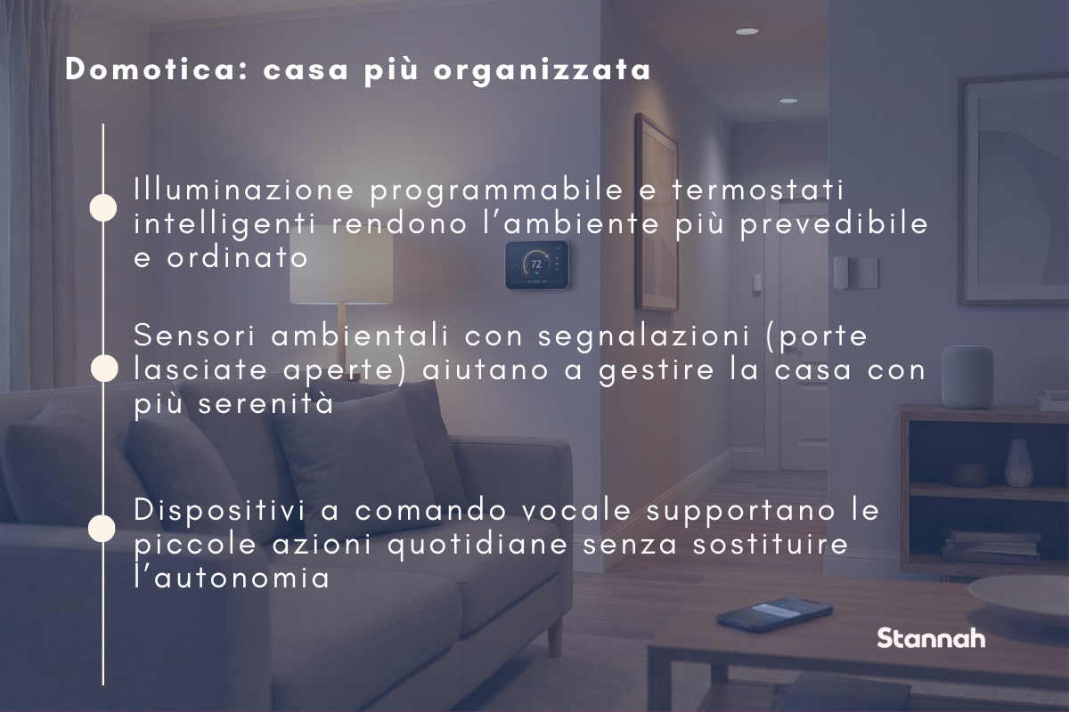 Accanto alle soluzioni strutturali, anche la tecnologia può contribuire a rendere la casa più organizzata e coerente con il proprio stile di vita. Le soluzioni di domotica più diffuse includono illuminazione programmabile, termostati intelligenti, sensori ambientali e dispositivi a comando vocale.