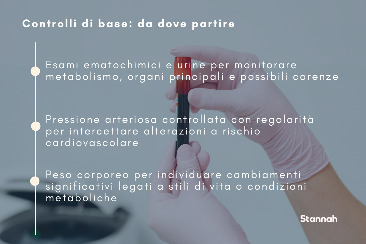 Un primo livello di controllo riguarda la valutazione dello stato di salute complessivo, attraverso esami che permettono di monitorare l’equilibrio dell’organismo: