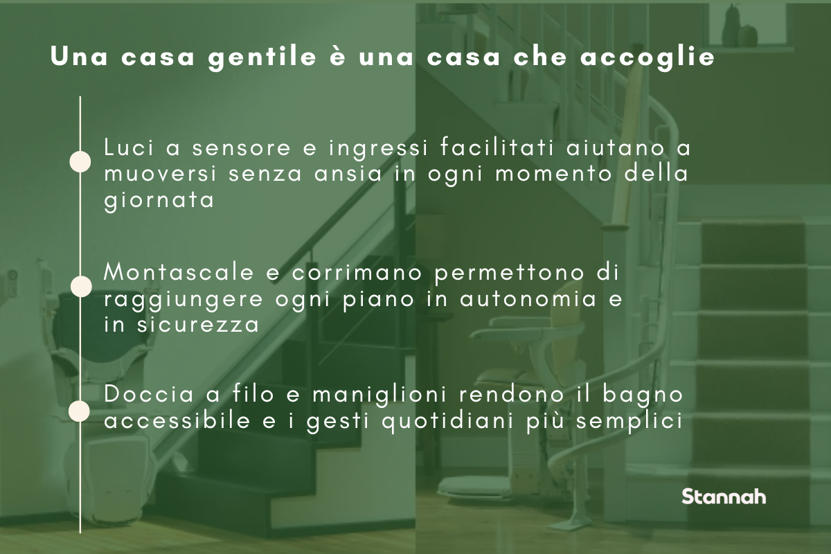 È fatta di dettagli premurosi: una luce che si accende al passaggio, una porta che si apre con facilità, un montascale che permette di salire senza fatica.